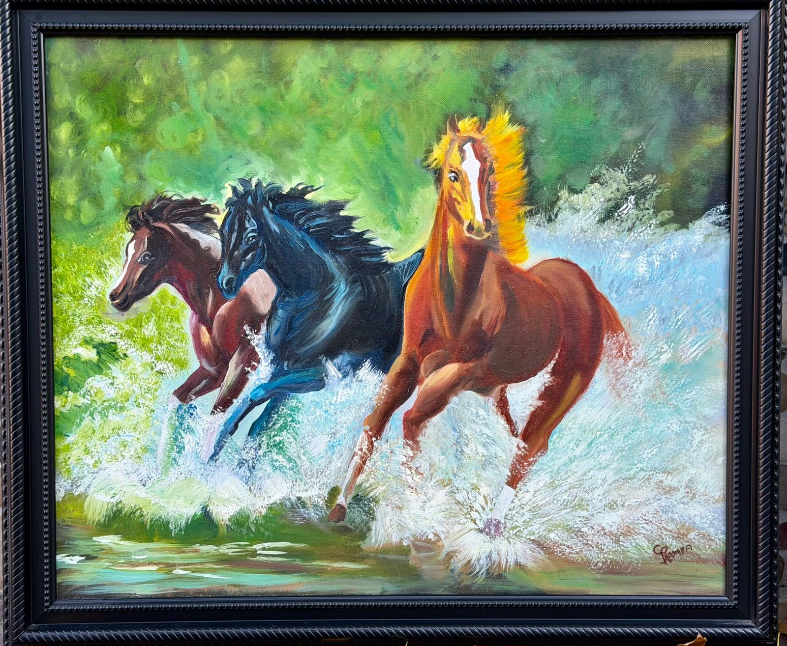 I didn’t want this painting to feel still. I wanted it to feel alive—like you can almost hear the sound of hooves and water, like the moment is happening right in front of you.